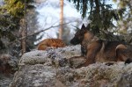 Tinni is a Norwegian dog that belongs to photographer Torgeir Berge in the forests of Norway . While exploring the woods together they came across a wild fox that they named Sniffer. Although Sniffer has never been domesticated in any way, Sniffer and Tinni became good friends. Now Berge observes Tinni and Sniffer from a distance, and luckily for us he captures their endearing friendship with his camera.